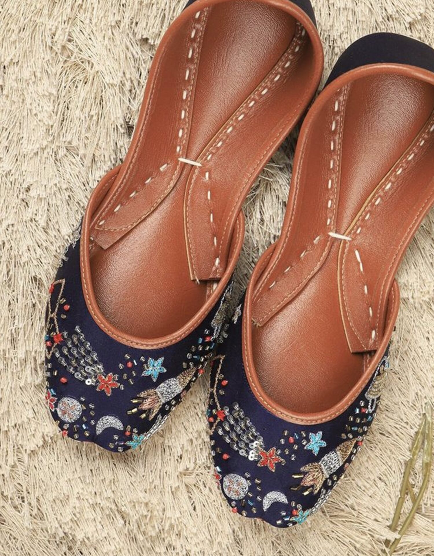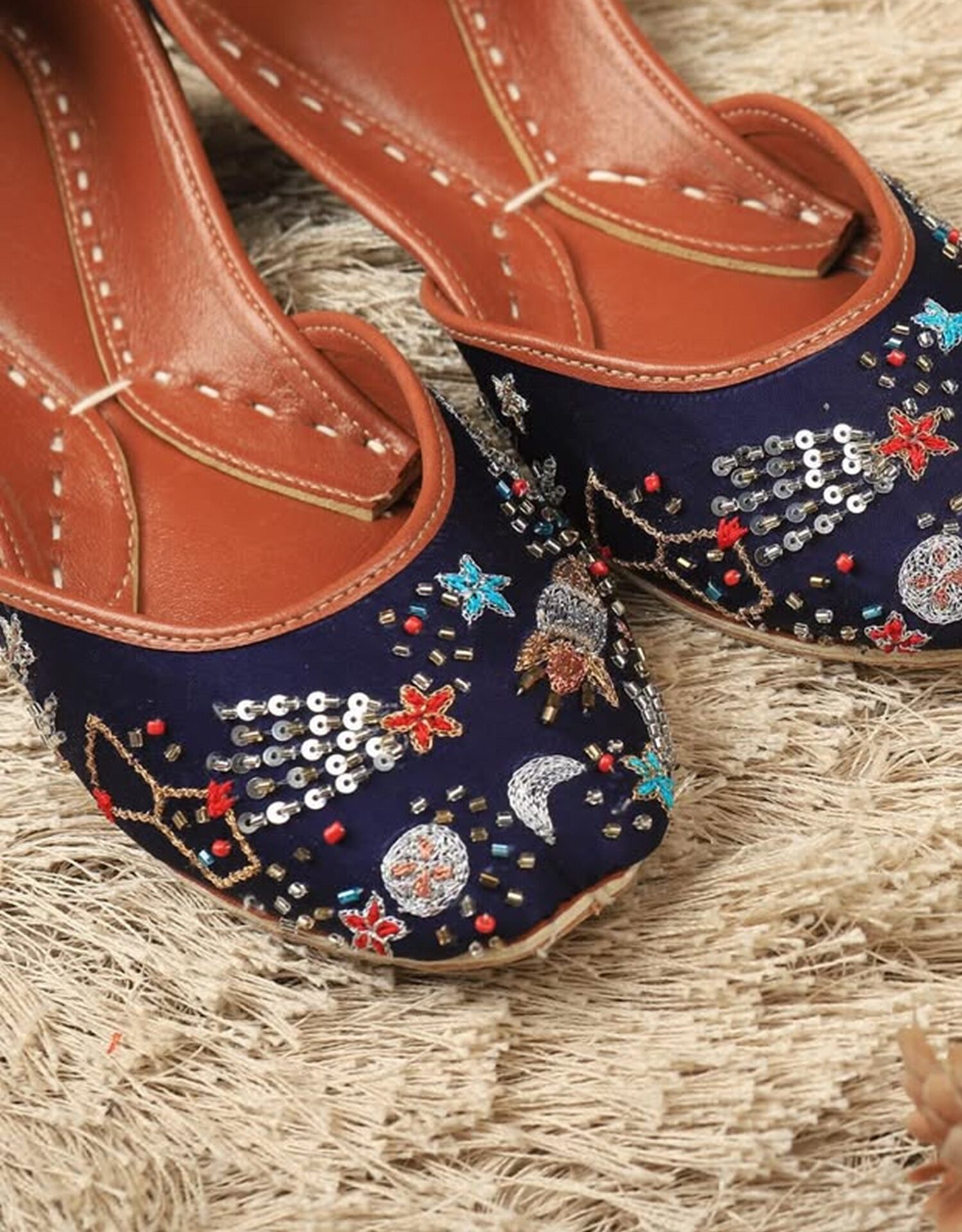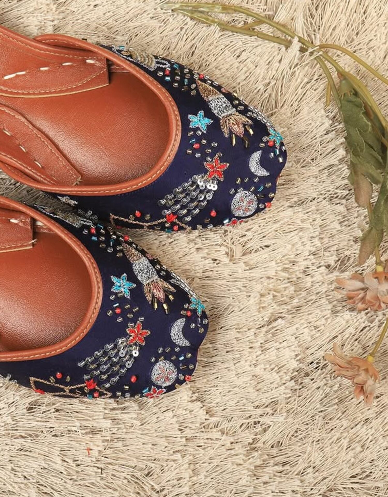 Step into the cosmos with our Galaxy Shooting Star Juttis – a perfect blend of celestial elegance and traditional craftsmanship. These handcrafted feature intricate bead and sequin embroidery inspired by shooting stars, moons, and galaxies against a deep midnight blue base. The soft leather lining and cushioned insole ensure comfort with every step, making them ideal for festive occasions or adding a magical touch to your everyday wear. Let your feet sparkle like the night sky!