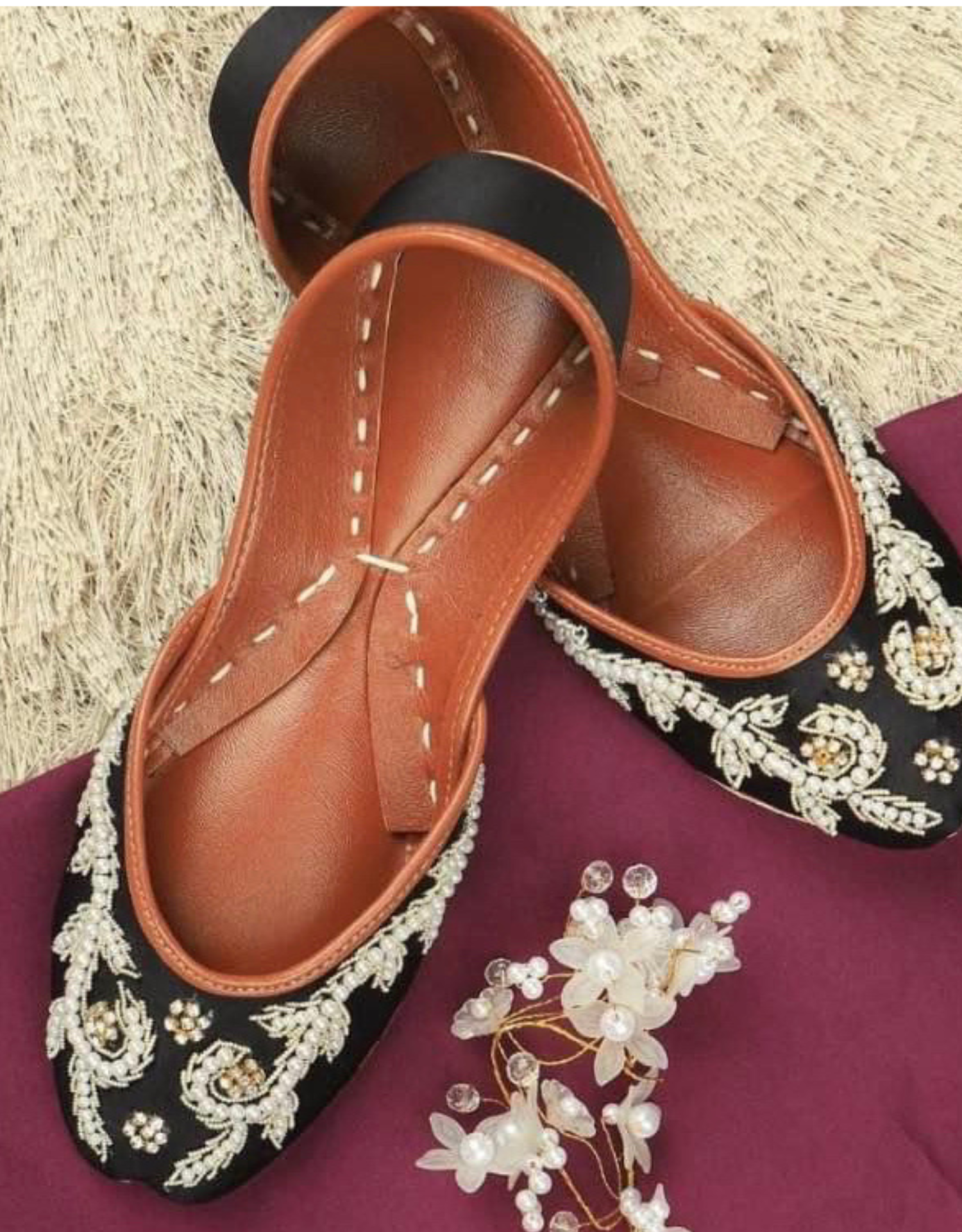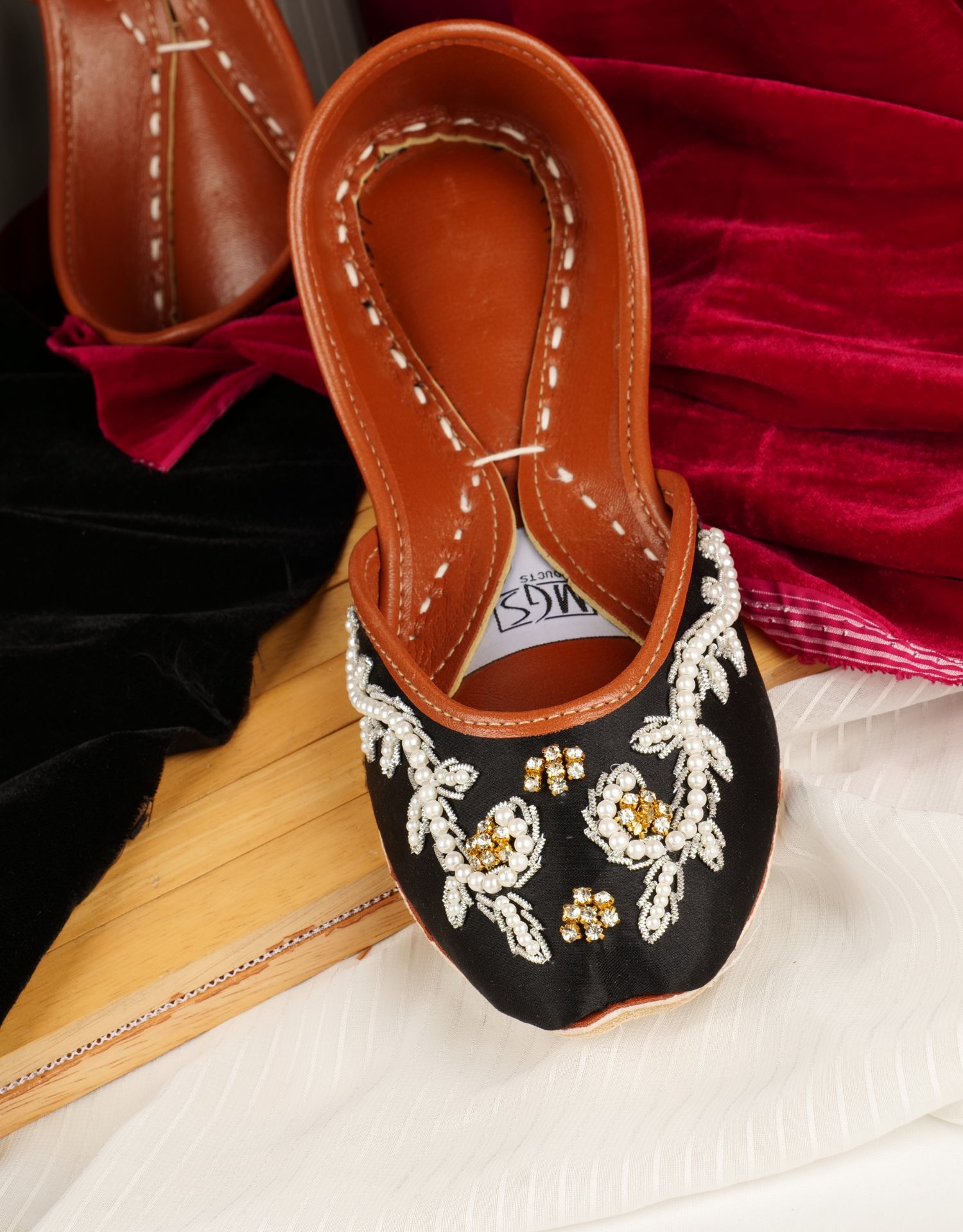 Step into elegance with these exquisite handcrafted juttis. Each pair is meticulously adorned with intricate hand embroidery featuring delicate white beads and shimmering gold sequins arranged in floral and vine motifs. The fine detailing on the classic black fabric base creates a striking contrast, making these juttis a perfect statement piece for festive occasions or elevating everyday wear.