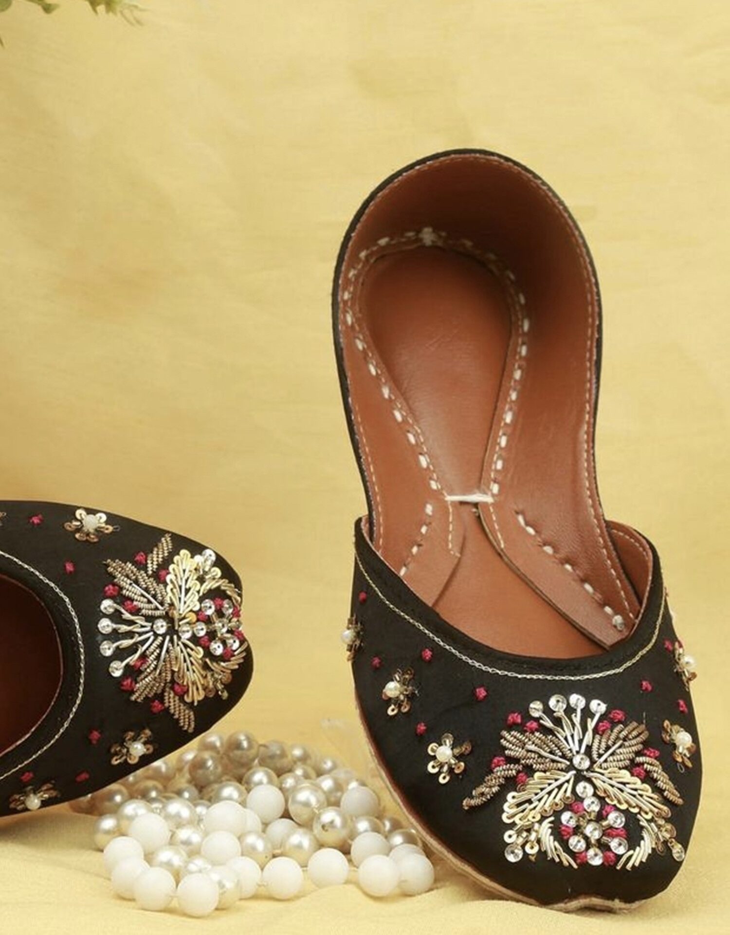 The Phool Patti juttis are a stunning blend of tradition and elegance, featuring intricate floral embroidery in gold, silver, and maroon tones on a rich black base. Handcrafted with precision, these juttis add a regal charm to ethnic ensembles, making them perfect for weddings, festive occasions, or cultural celebrations.