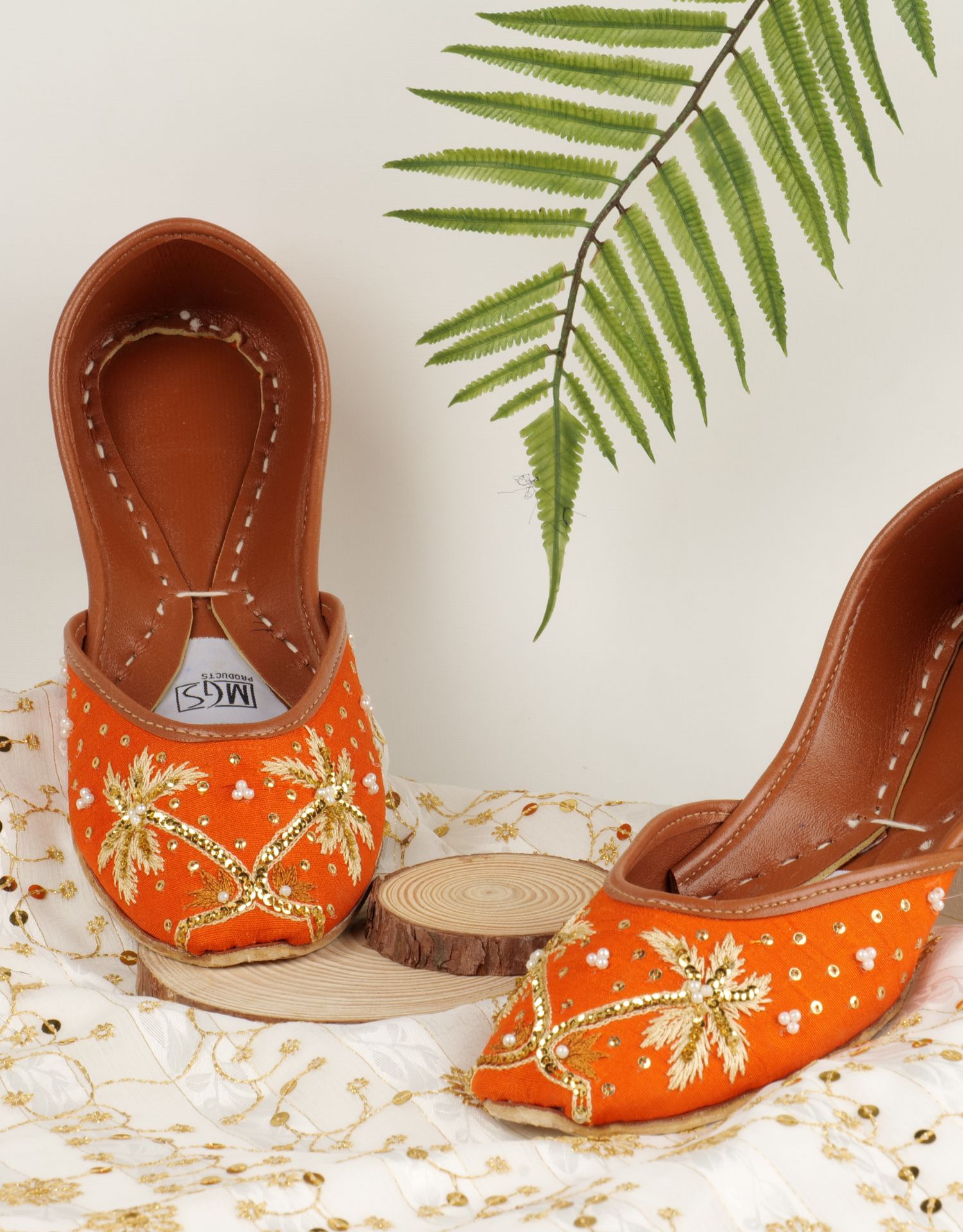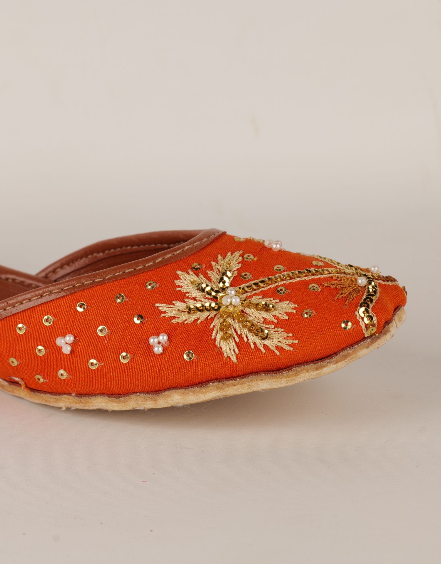 Inspired by the nature 🌴, Stand out with this vibrant orange Khussa decorated with unique golden palm tree motifs and scattered embellishments. It’s playful yet rich, bringing a lively flair to summer weddings or festive gatherings.
