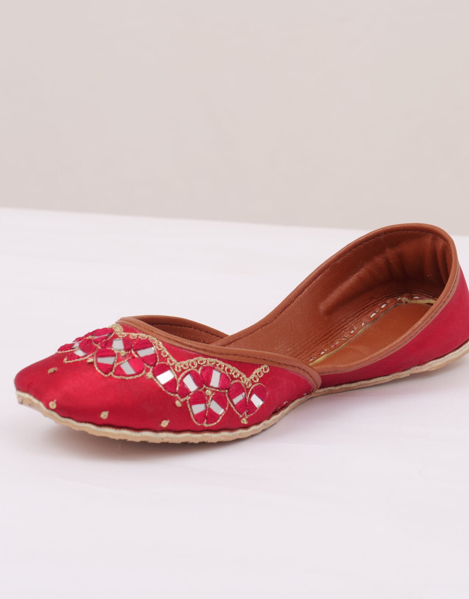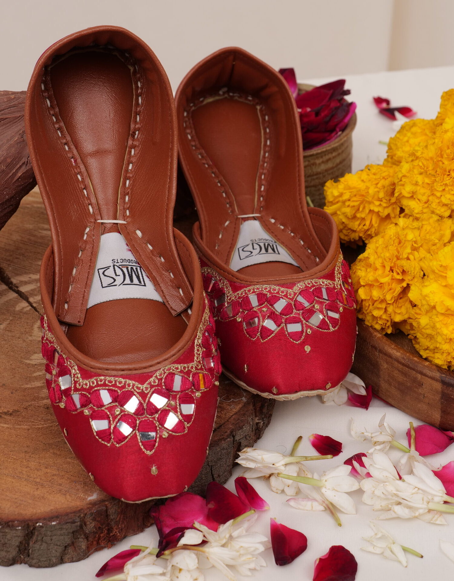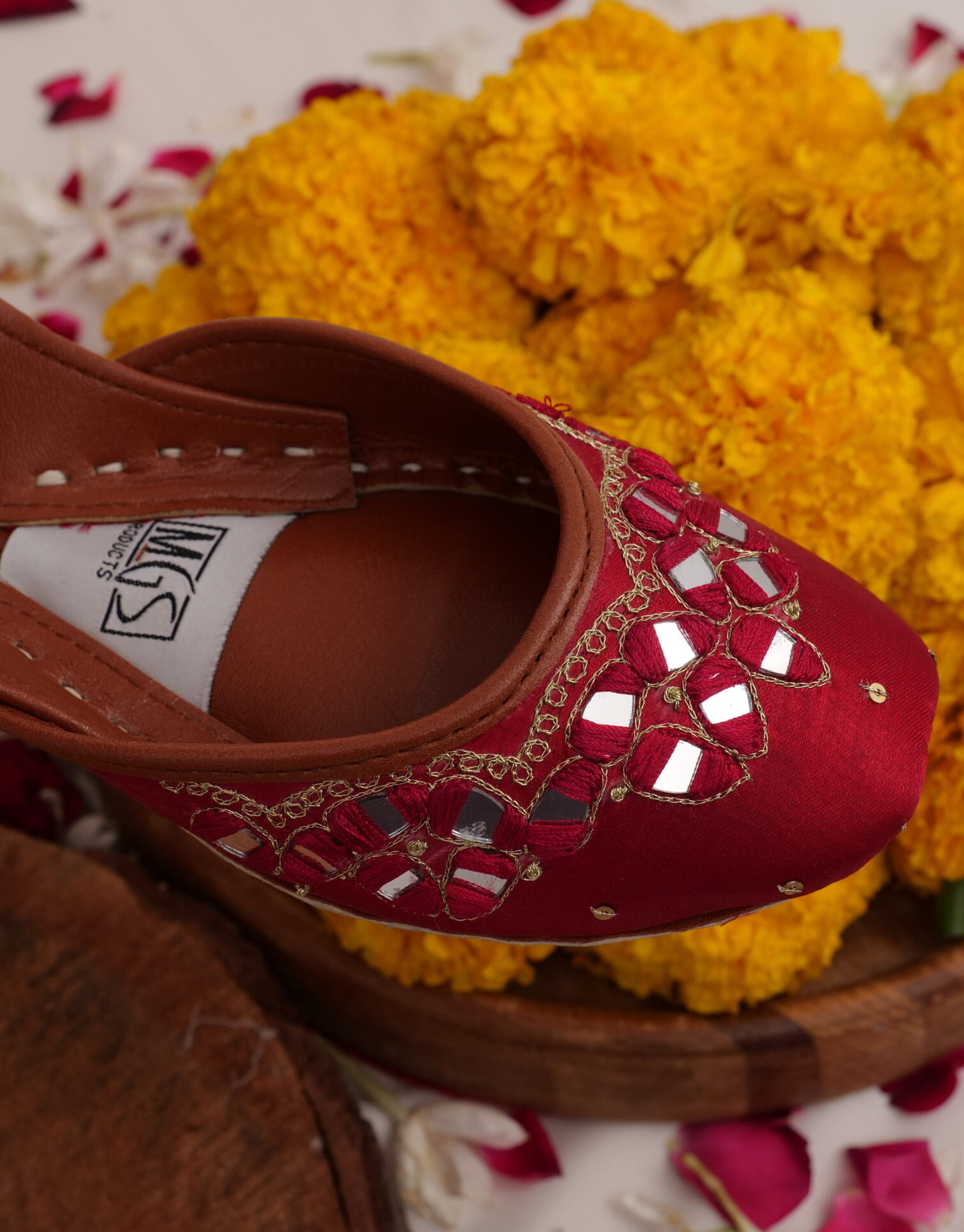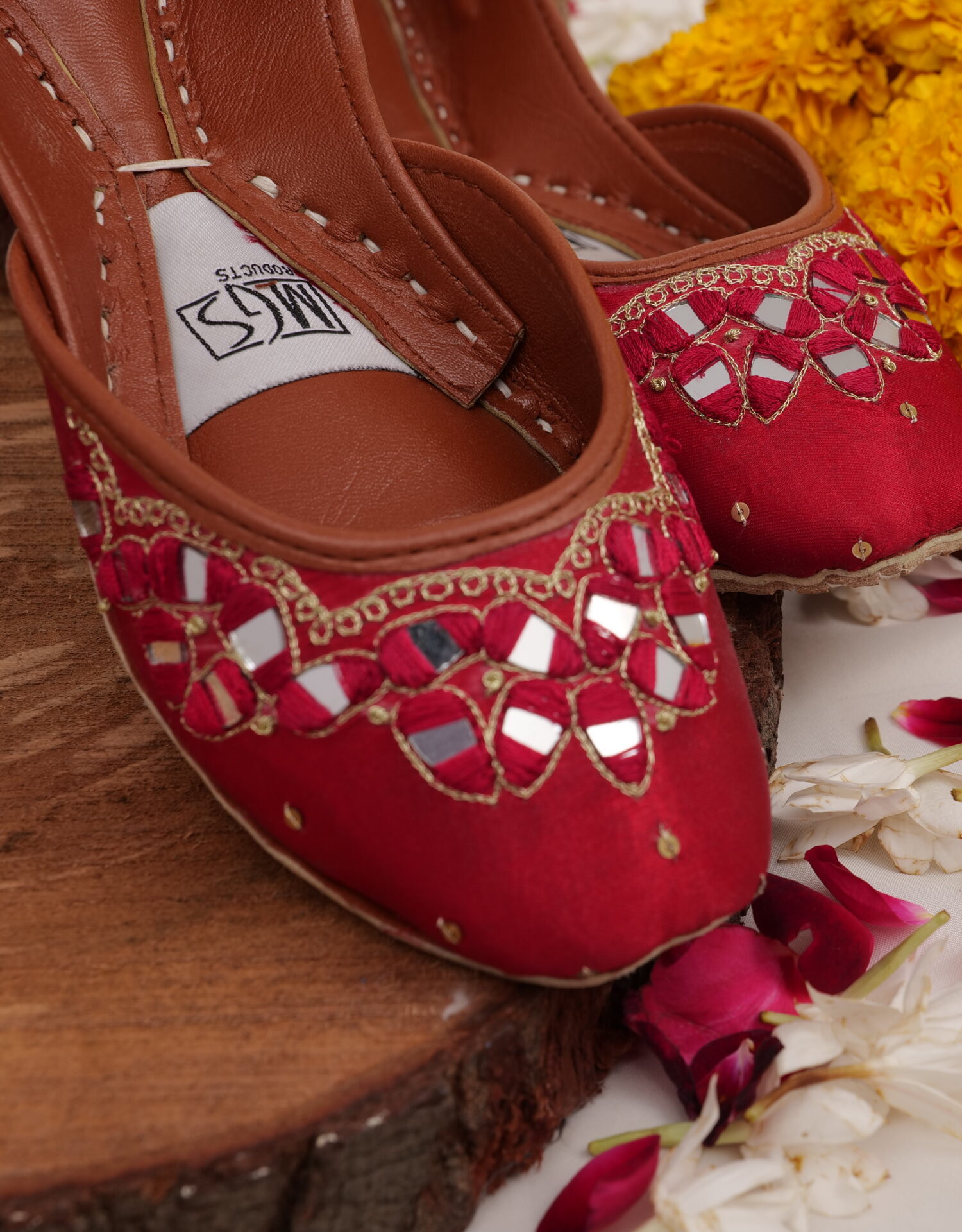Crafted from luxurious red silk, this stunning jutti features intricate mirror, cora, and resham embroidery, showcasing the skill and dedication of our master artisans.