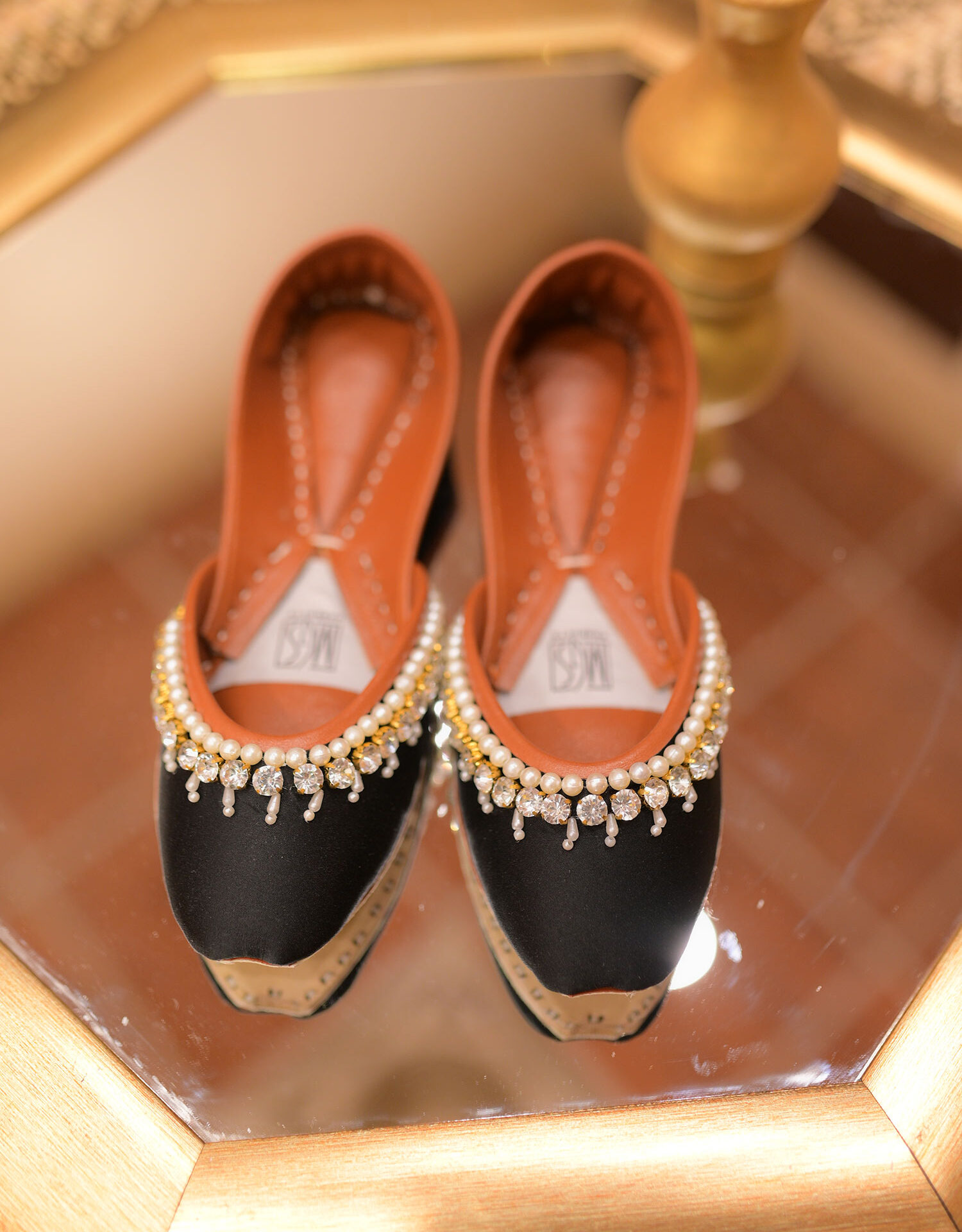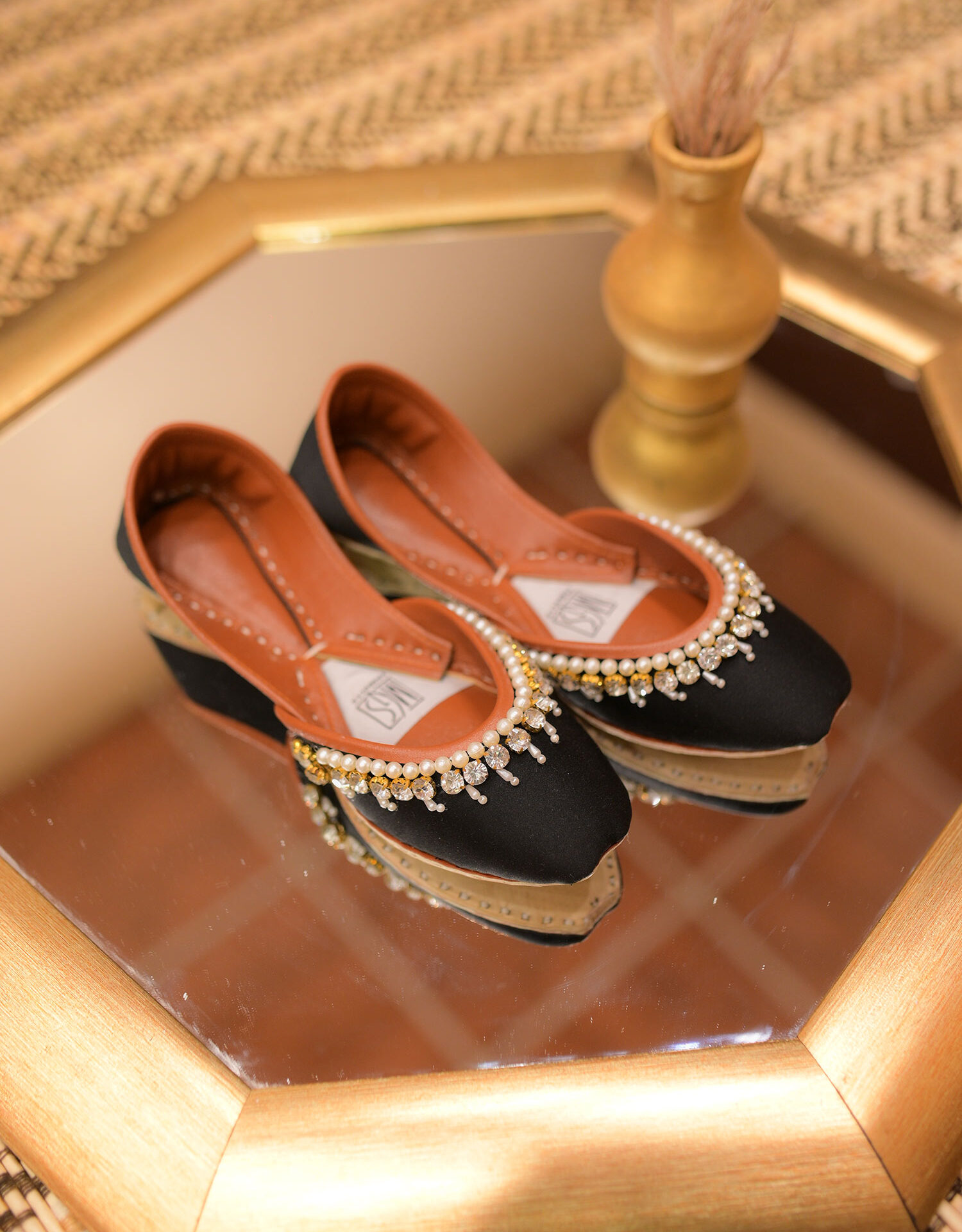 The Zarina Noir is all about royal elegance. Crafted on a smooth black satin base, this masterpiece is adorned with a regal mix of shimmering crystals, delicate pearls, and golden bead drops. The intricate hand embellishments make it perfect for evening weddings, festive dinners, or whenever you want to make a sophisticated statement.